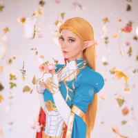 cosplay attire inspired by the character Link from the game "The Legend of Zelda: Breath of the Wild". The outfit includes elements such as the blue tunic, golden gauntlets, and a sword that are characteristic of Link's