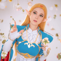 The image features a person dressed in cosplay attire that resembles the style of characters from "The Legend of Zelda" series, which is a popular