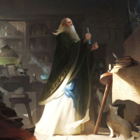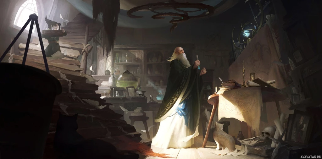 a fantasy scene with an older wizard-like character at the center. This character is standing in a room that appears to be part of an abandoned or neglected establishment, possibly a library or an alchemist's workshop given