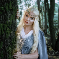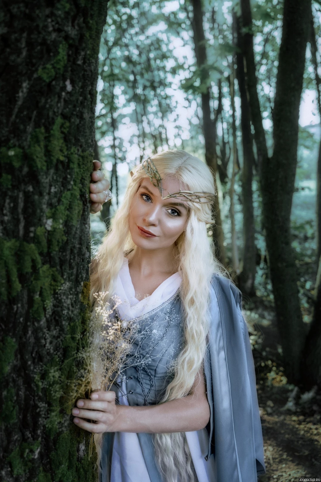 The picture features an individual dressed as a character from Middle-earth, specifically resembling Galadriel. This person is wearing long