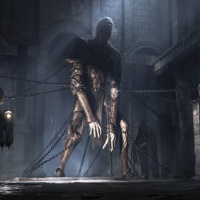 На картинке изображена сцена из видеоигры "Dark Souls 2". На ней изображено существо с механическими деталями и цепями, стоящее в интерьере, напоминающем темницу или подземную камеру. Здесь царит атмосфера ужаса и напряжения, которая характерна для этого жанра игр в жанре фэнтези/хоррор.