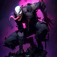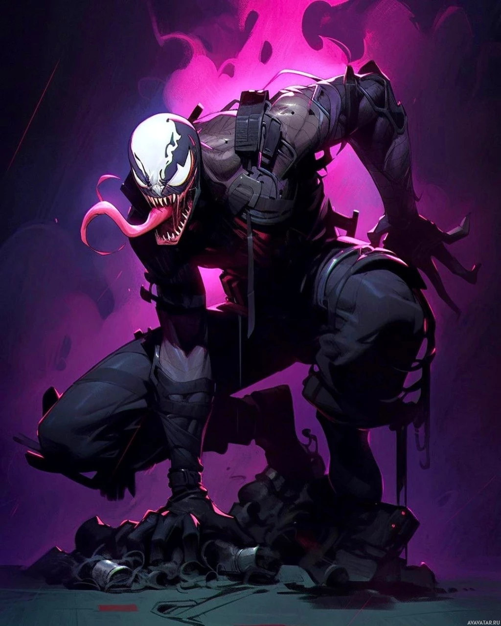 Изображение представляет собой художественное изображение персонажа Венома. Он изображен в мрачной, зловещей обстановке в фиолетово-черной цветовой гамме. Его костюм симбиота украшен характерными белыми полосками, и он изображен с высунутым языком, обращенным к зрителю, в классической угрожающей позе.