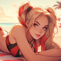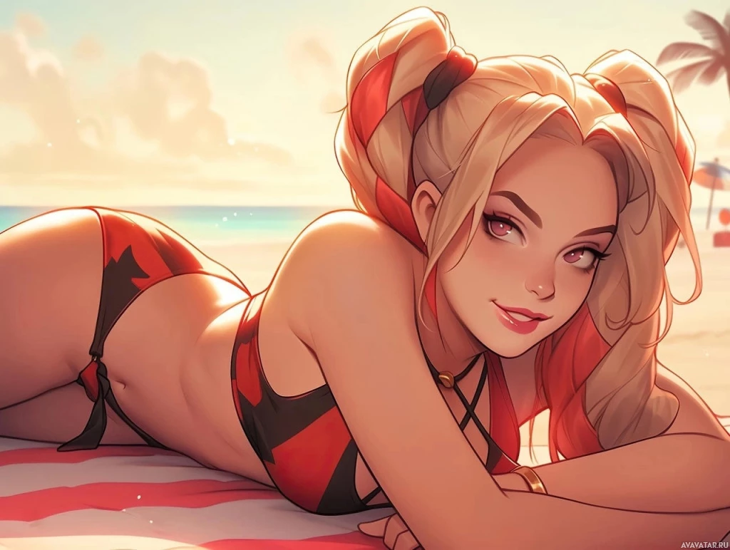 Harley Quinn from the Batman franchise, lying on her stomach on a beach. She is wearing a swimsuit with a red and black pattern that matches her