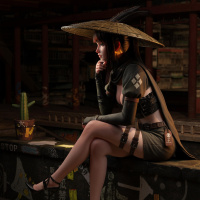 На снимке изображен женский персонаж, который, по-видимому, является персонажем видеоигры или мультсериала. У нее темные волосы, и она одета в костюм, который включает в себя что-то вроде доспехов или защитного снаряжения, а также аксессуар в виде зонта на голове. Обстановка ночью напоминает городской переулок, на заднем плане видны граффити на стенах.