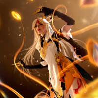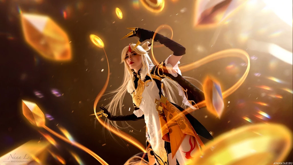 a female character with white hair, dressed in what appears to be armor or cosplay attire inspired by the video game "Genshin Impact." She is standing amidst a magical or elemental display that includes