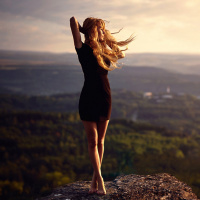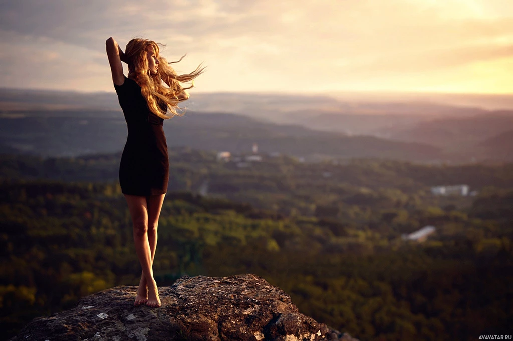 The image features a person standing on top of a mountain or hill, with their arms raised to the sky as if they are embracing nature or experiencing