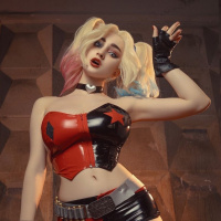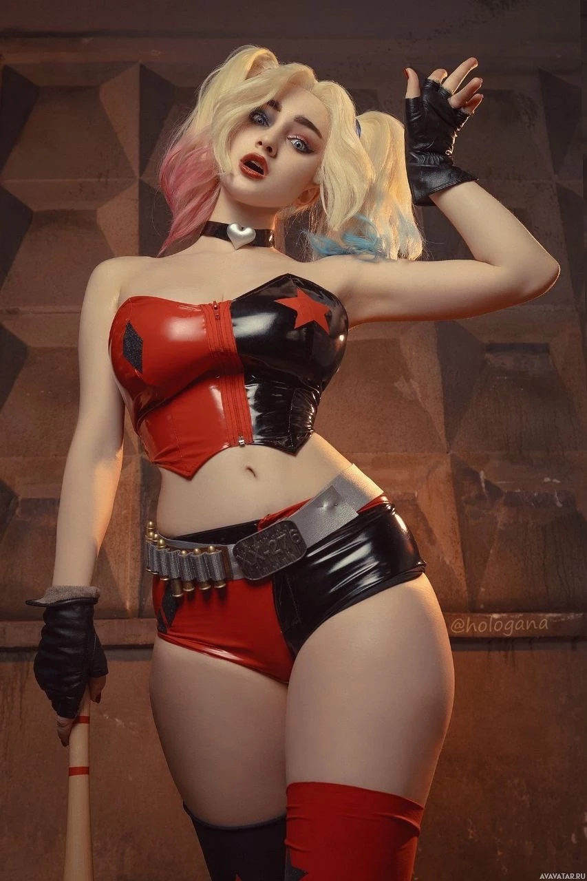 a baseball bat. The makeup and hairstyle are also reminiscent of Harley Quinn's character, complete with her signature black and white face paint,