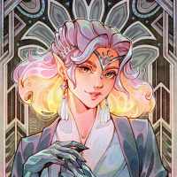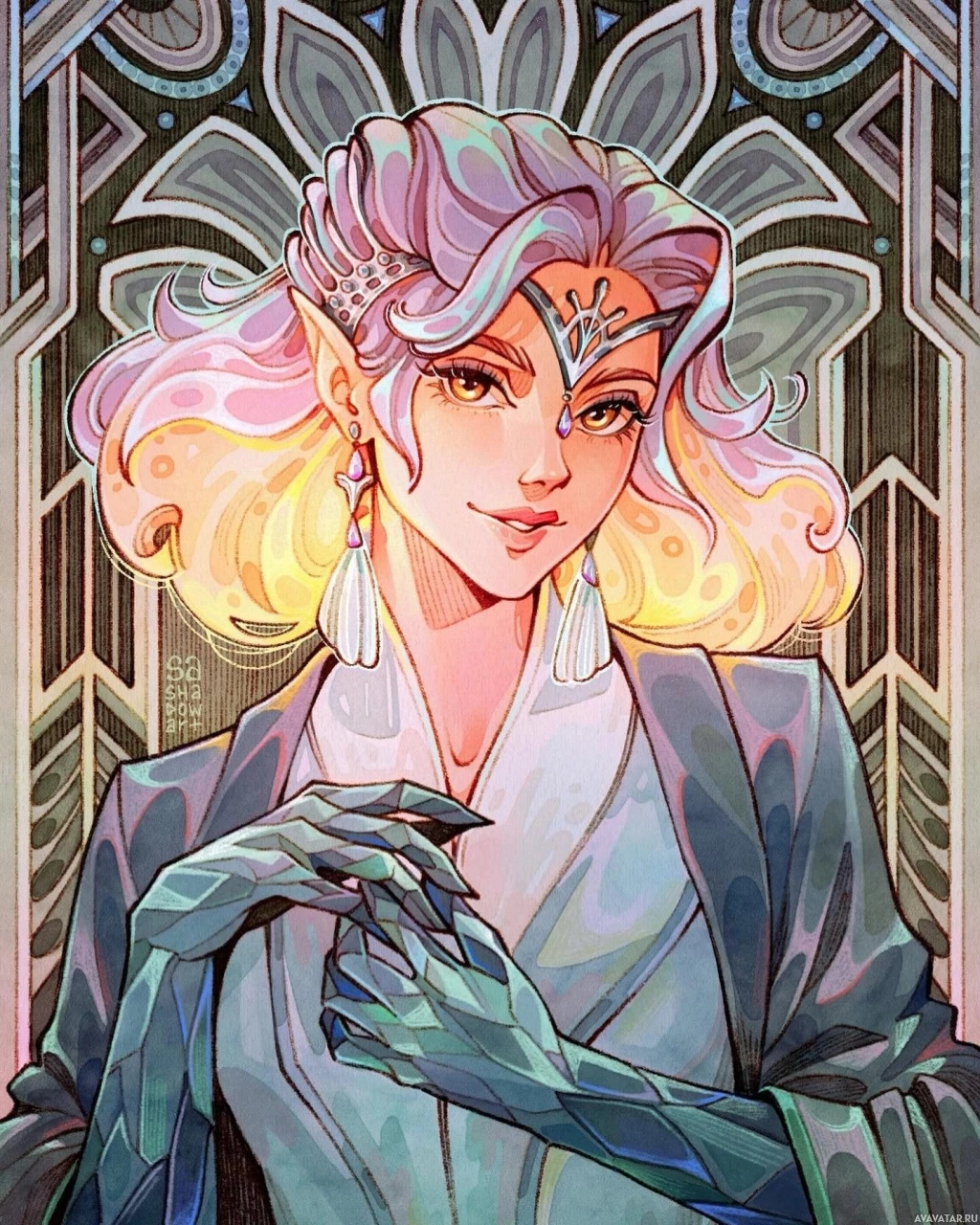 fantasy genres. The character is depicted in a pose that suggests she may be singing or speaking, and she has