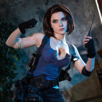 The image features a person cosplaying as Jill Valentine, a character from the Resident Evil video