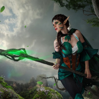 a green outfit and has a bow in her hand. There are magical elements around her, such as