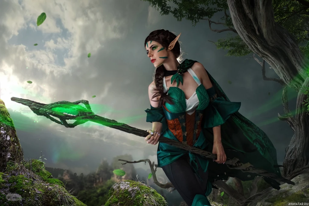 The image depicts a fantasy-themed character, which appears to be an elf. She is wearing
