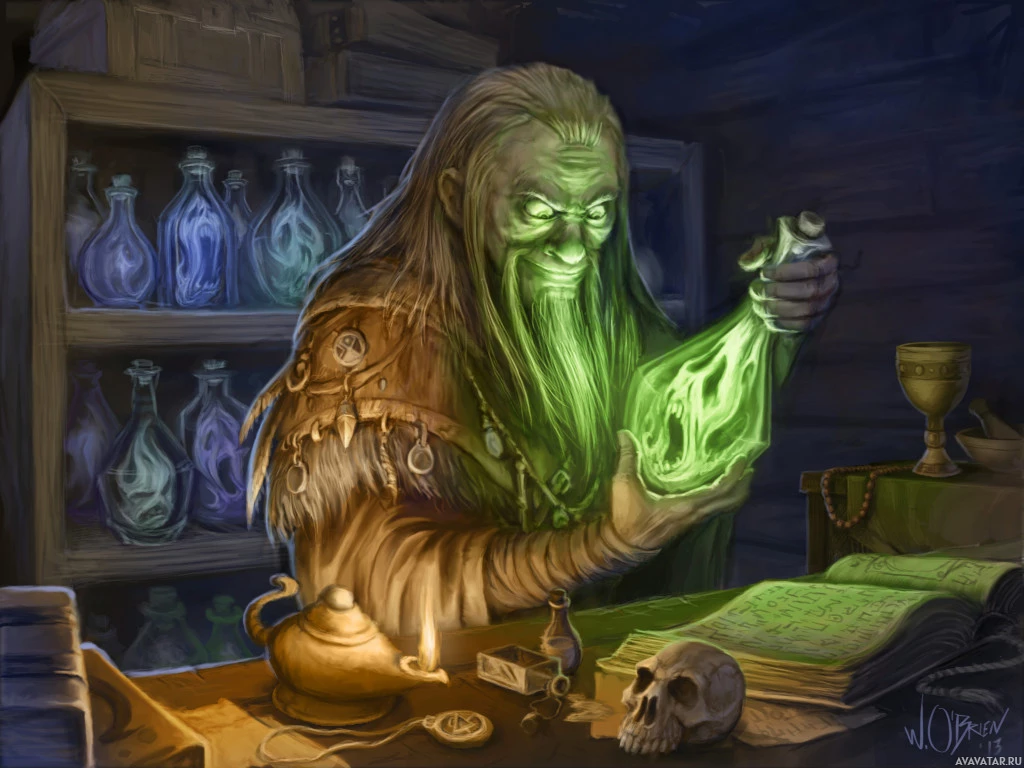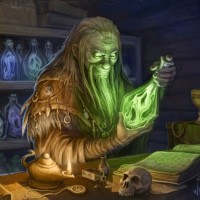 an elderly mage or alchemist. The character is surrounded by