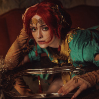 red hair and is wearing ornate, fantasy-style clothing with intricate details, such as embroidery and jewelry, that reflect the aesthetic of Triss' character within the game. The setting looks like an interior space with classical design elements, and there are decorative items on a table in front of the person, adding to