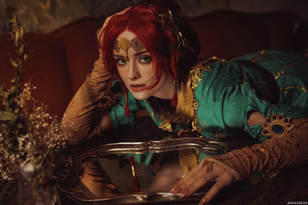 The image depicts a person dressed in elaborate costume that appears to be inspired by the character Triss Merigold from "The Witcher 3: Wild Hunt"
