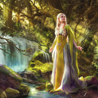 The image depicts a fantasy character who appears to be an elf. She has long, blonde hair and is wearing a traditional fantasy-style dress with intricate details. The setting suggests a serene, natural environment, possibly within a forest or near a waterfall, which adds to the mystical atmosphere of the image.