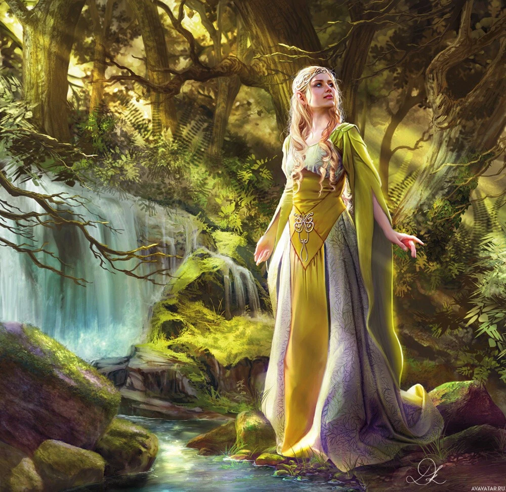 Картинка показывает вымышленного персонажа, который кажется эльфом. Она имеет длинные светлые волосы и носит традиционное платье в стиле фэнтези со сложными деталями. Обстановка предполагает безмятежную, природную среду, возможно, в лесу или около водопада, что добавляет мистическую атмосферу образа.