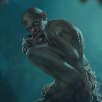 The image features a character from Middle-earth, resembling Gollum. The character is shown in a crouched position with an intense gaze, sitting on the edge of what appears to be a rocky cliff or ledge within a cave-like setting. The overall mood of the image suggests a sense of anticipation or focus.