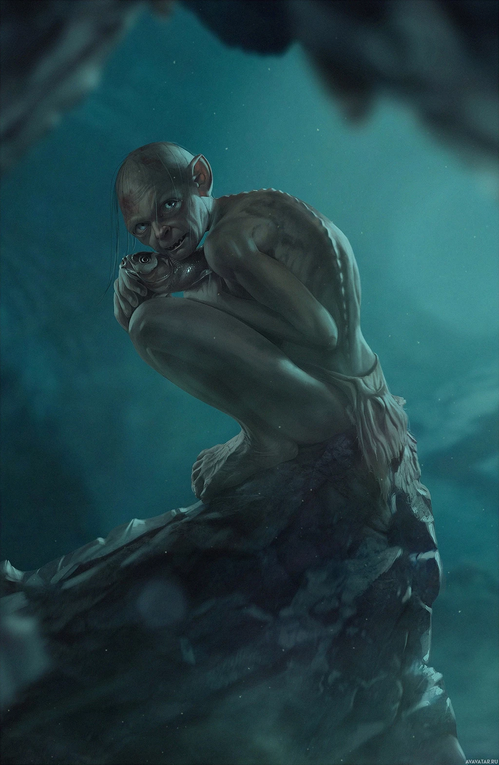 На картинке изображен персонаж из Средиземья, напоминающий Голлума. Персонаж показан в приседенном положении с интенсивным взглядом, сидящим на краю того, что кажется скалистым утесом или уступом в пещерной обстановке. Общее настроение изображения предполагает чувство предвкушения или сосредоточенности.