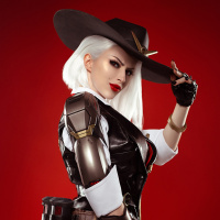 the video game "Overwatch." The individual is dressed in a costume that resembles Ashe's