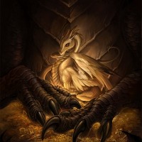 sharp teeth and claws, sitting in what appears to be a cave or underground chamber. Inside this space, there's a smaller creature that looks like a bird or perhaps a mythical being with a blend of avian and human features, seated comfortably between the dragon's