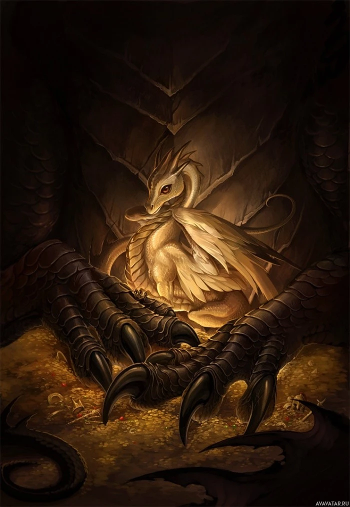 gold coins scattered around, which might imply that this is a place where valuable items are found or guarded by the dragon. The artwork is rich in detail and evokes a sense of wonder and the supernatural.
