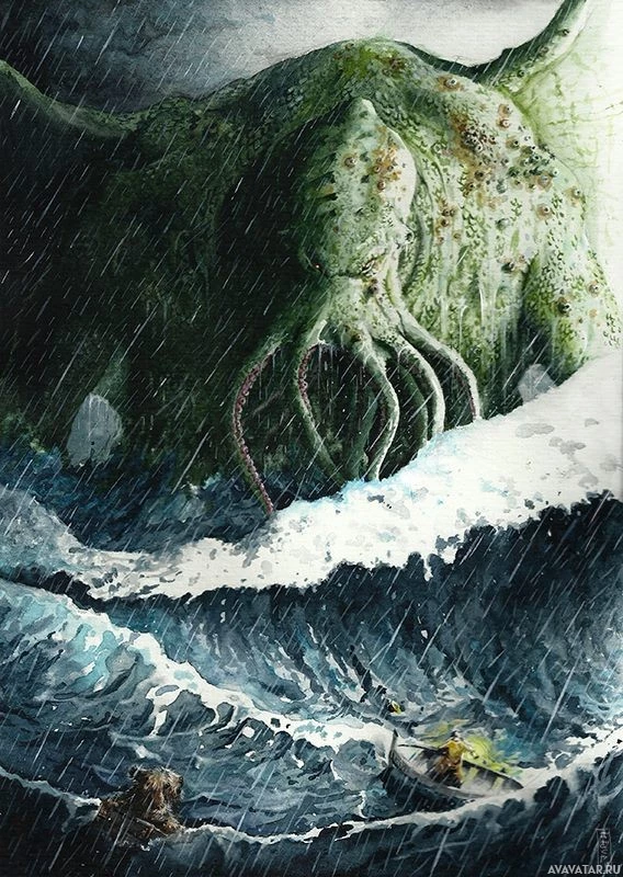 an underwater city, with waves crashing around it. In the background, there are figures that seem to be in distress or danger, as they appear to be drowning or struggling against the sea. The overall atmosphere is dark and ominous, fitting the description of a Cthulhu-themed image.