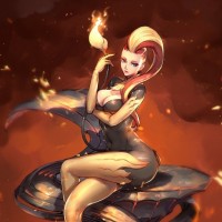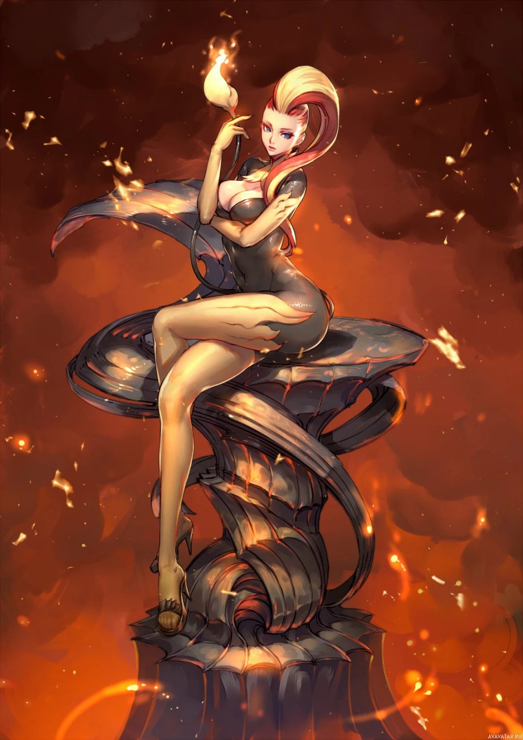 a female character. She appears to be standing on a platform or statue that is shaped like a serpent or dragon, with fiery emanations around her, suggesting she has some sort of