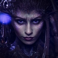 purple eyes and what appears to be elongated hair or tendrils adorning her head. Her expression is intense and focused. The background has a moody,