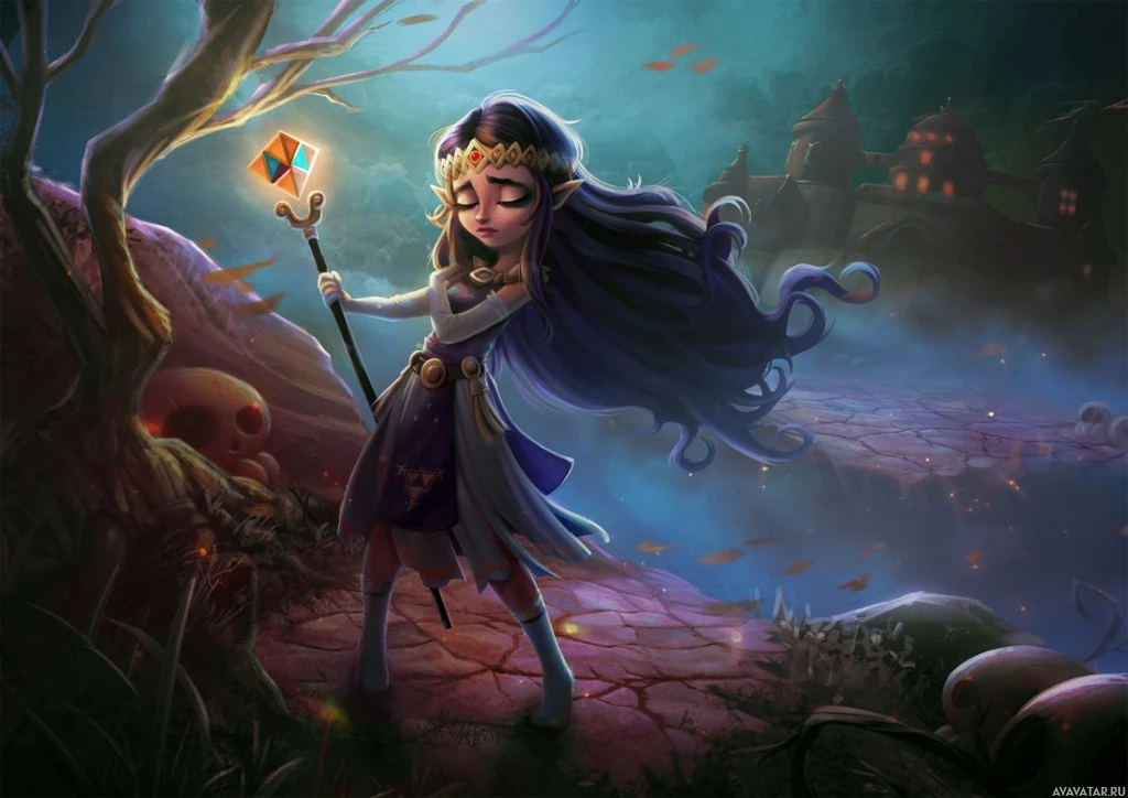 a glowing orb on top of it. Her hair is styled into a braid, and she has a somewhat melancholic or contemplative expression. The background suggests a magical, otherworldly environment with spooky elements like gravestones and