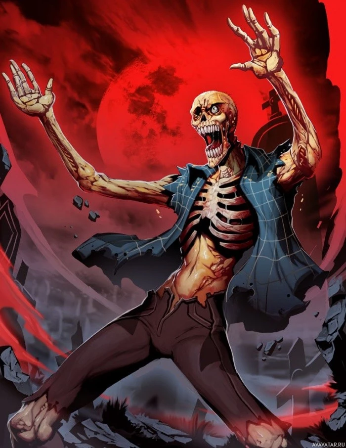 supernatural forces, such as magic or the undead curse. The zombie is shown in mid-motion, arms outstretched, suggesting movement or