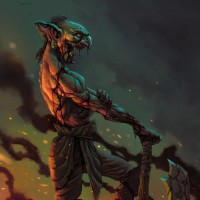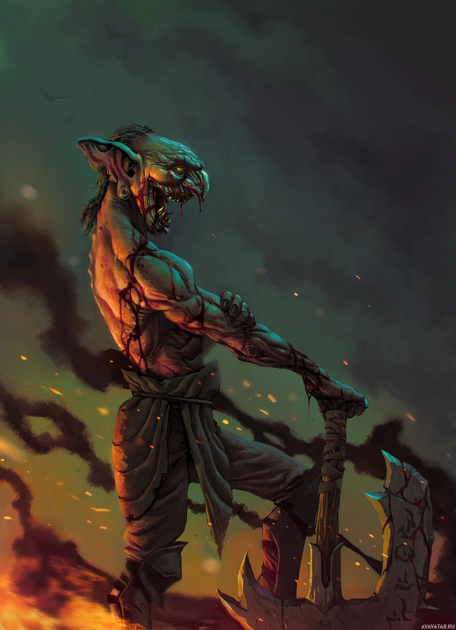a goblin character. The goblin is depicted in a fierce pose, holding