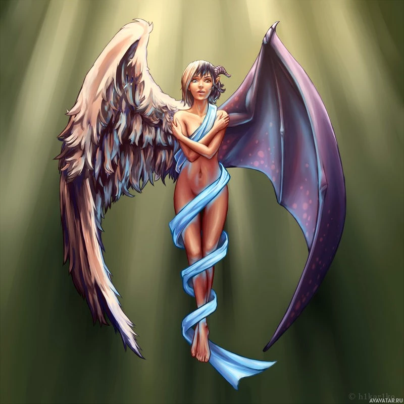 sinister nature. They are both nude, which can be interpreted as a metaphor for the vulnerability or innocence often associated with angels, in contrast to the corruption typically associated with demons. The overall theme suggests a blend of good and evil, which is common in