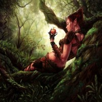 a fantasy scene featuring an elf-like character in a forest setting. The character is shown reclining on the branches of a tree, holding what appears to be an apple or similar fruit in one hand and