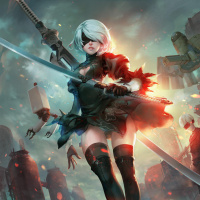 character in the foreground is holding a sword and seems to be leading or preparing for combat. In the background, there are other characters with similar attire, suggesting they are part of the same group. The setting appears to be a dystopian