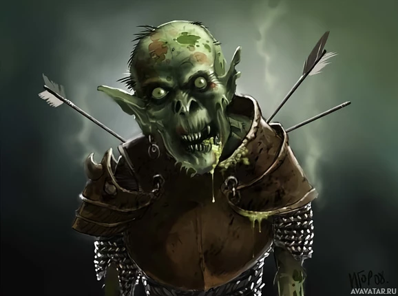 fantasy orc representations. This creature is wearing armor and has arrows protruding from its body, suggesting it might have been attacked or defeated in battle. The background is dark, enhancing