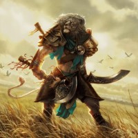 a dual purpose as both a warrior and a hunter. In the background, there is a lion, which could be interpreted as
