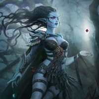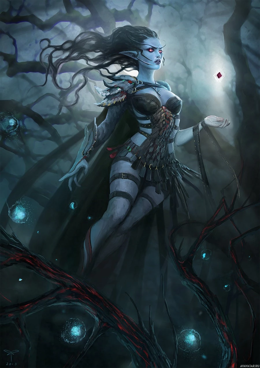 a fantasy character that appears to be a drow, which is often associated with dark elves in fantasy settings. This