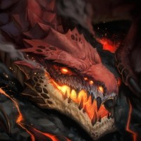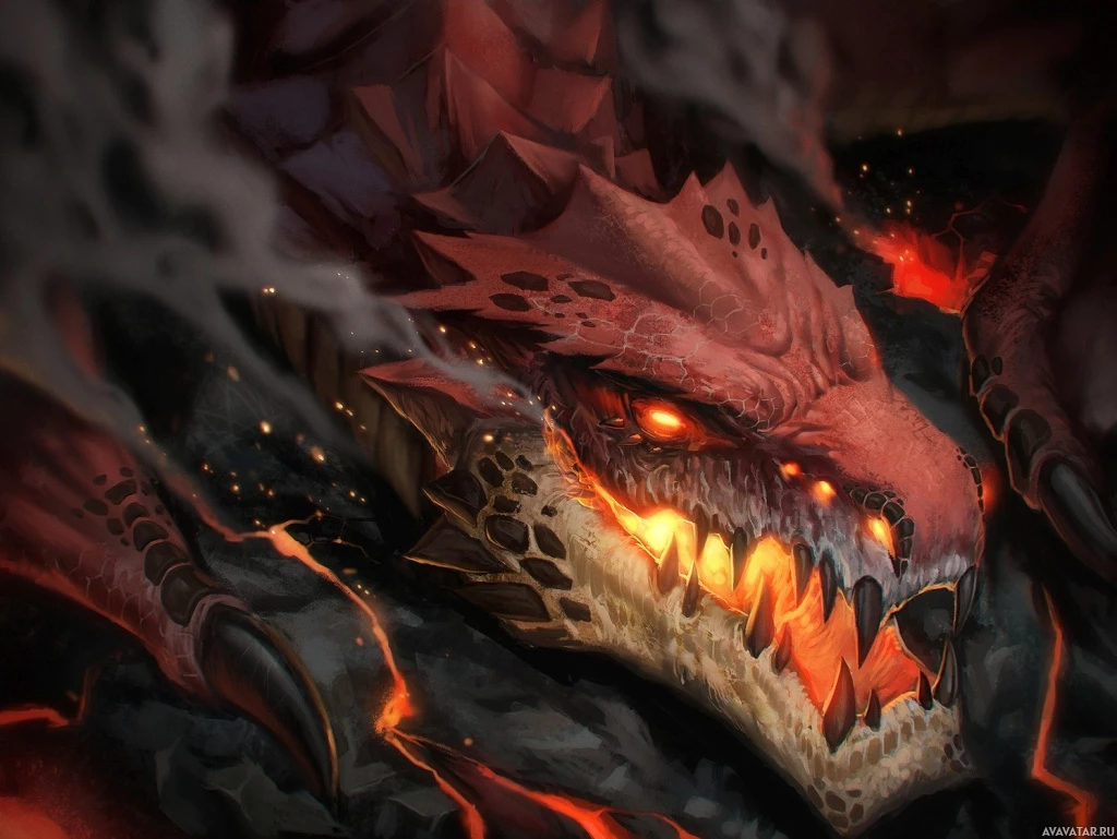sharp teeth, possibly indicating a state of anger or aggression. Surrounding the dragon are flames, which could symbolize its power or be part of its natural