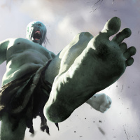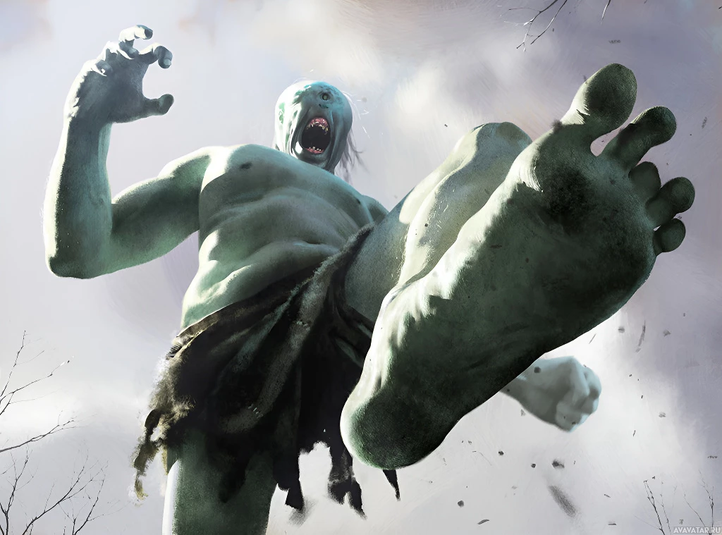green skin and appears to be angry, as indicated by its scowling expression and the muscles of its arm visibly straining from its powerful pose. The background suggests