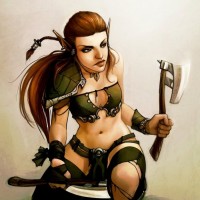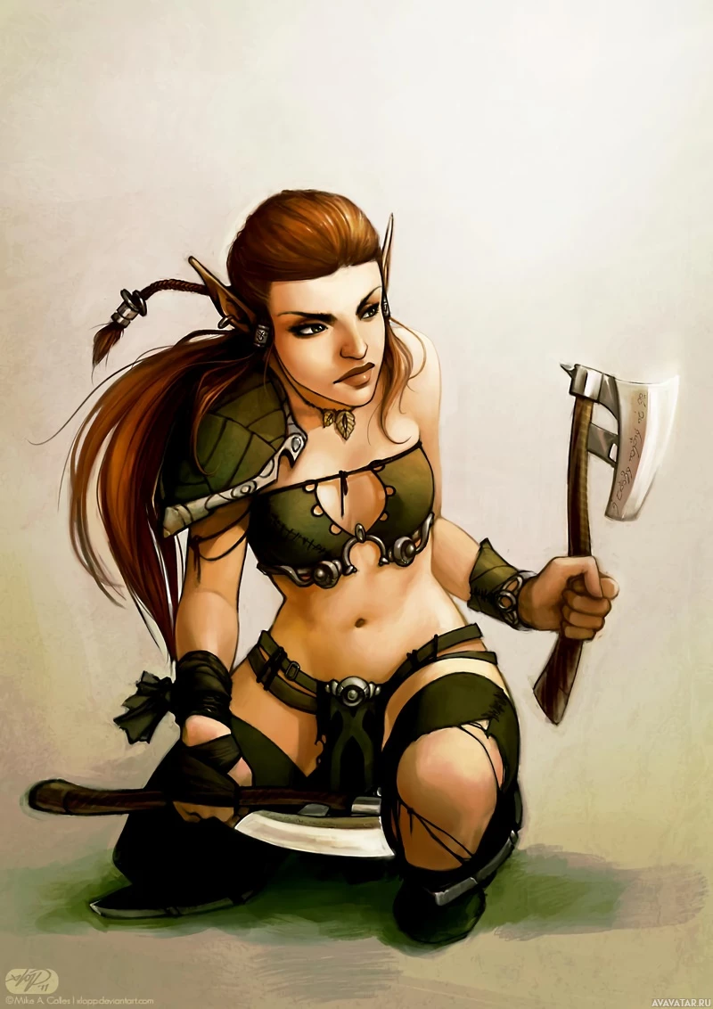 red hair and is wearing a fantasy-style armor with leather elements, including boots, a chest piece, and gauntlets. She is holding an axe in her right hand, which she seems to be pointing towards something or someone out of frame. The character is squatting down on one knee, giving her a confident and assertive pose. The art style suggests it could be from a fantasy-themed game or