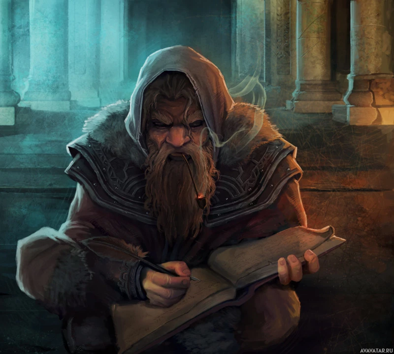 a hooded cloak and has a beard, suggesting a wise or scholarly demeanor. The setting seems to be a dimly