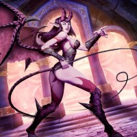This image features a fantasy-themed depiction of a character that appears to be a succubus. The character is shown in an action pose with horns and wings, which are commonly associated with succubi in mythology and