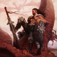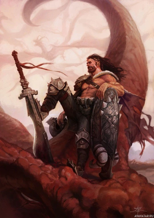 long hair and a beard, dressed in what appears to be armor or battle gear, including a sword at his side. He stands confidently on the edge of