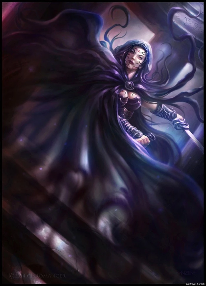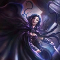 purple hair and is wearing a dark hooded cloak with flowing elements, suggesting movement or mysticism. They are holding what looks like a staff or wand, which adds to the magical or enchanted atmosphere of the image. The character's expression seems contemplative or intense, fitting for a scene from