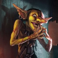 an eerie ambiance over the scene. The goblin is dressed in tattered and soiled clothing, with its ears pointed upwards, indicative of
