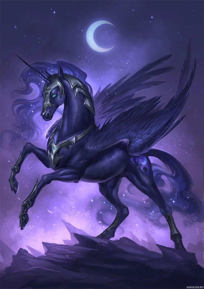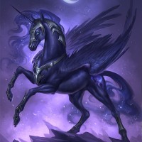 the body structure of a horse but is adorned with wings like an angel or a bird. Its coat is a deep, almost