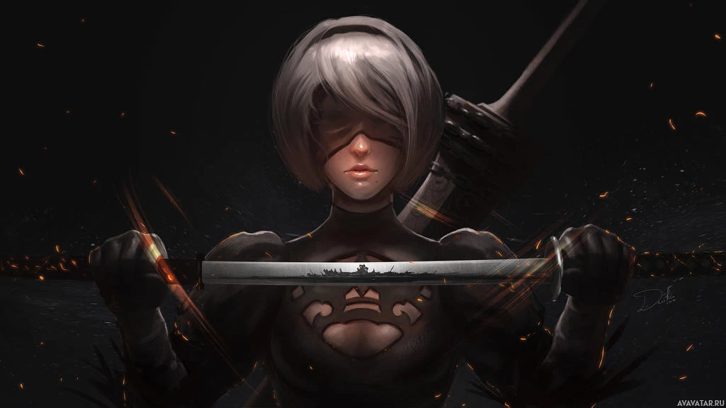 The image depicts an animated character known as "2B" from