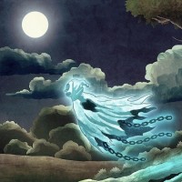 ghostly figure, which appears to be a humanoid shape, is floating through the air. This entity has