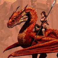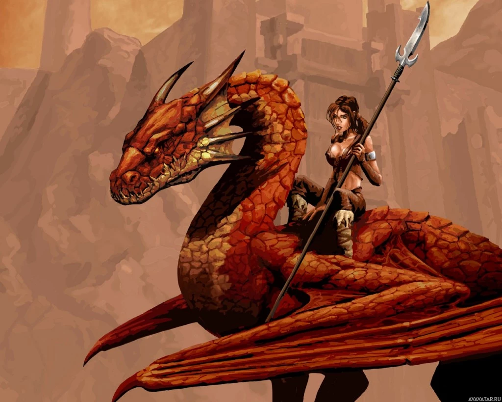 a female warrior riding on the back of a dragon. She is wielding a spear and wearing armor, which suggests she might be