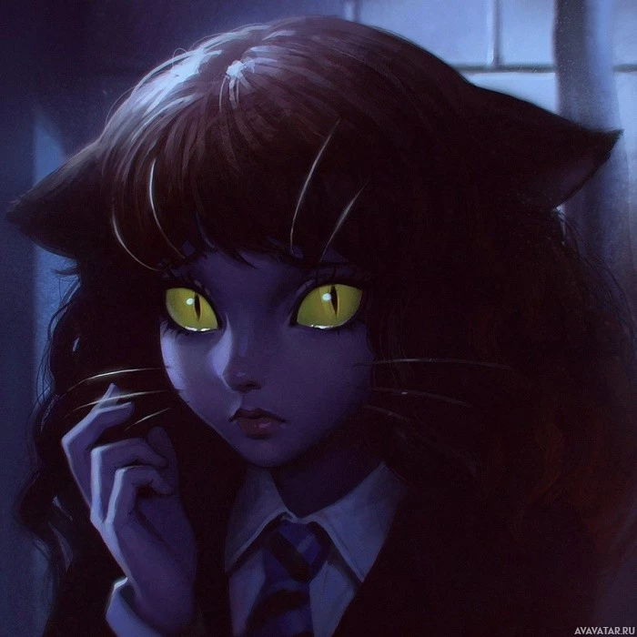 a young girl with cat-like features. She has prominent feline characteristics such as pointed ears, slitted eyes, and whiskers, which are often associated with the appearance of fantasy or